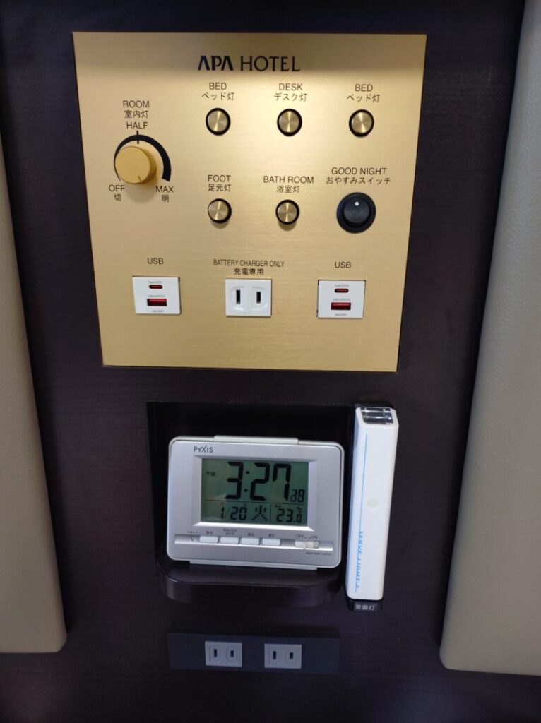 そして真ん中には時計やコンセントUSB、各電気のスイッチがあります。